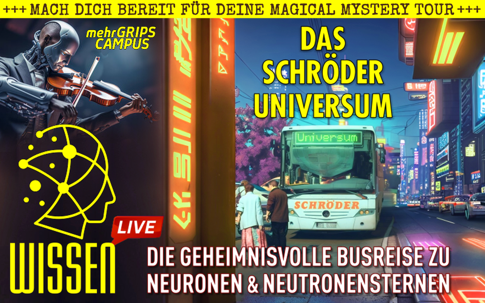 °GEHIRN GENIAL & °WISSEN.LIVE | Mit den Worten »Hallo alle … und herzlich willkommen. Der Letzte macht das Licht aus!« begrüßt Reiseführer Rainer W. Sauer alle zwei Jahre die Teilnehmer seiner „geheimnisvollen Busreise zu Neuronen & Neutronensternen“, kurz: »DAS SCHRÖDER UNIVERSUM«*. – Nebenbei bemerkt: Hintergrund seiner Bemerkung zum Ausschalten des Lichts ist das von Astrophysikern prognostizierte Ende von Allem, sprich: Nach dem Erlöschen des letzten Sterns in der finalen Galaxie wird im Weltall absolute Dunkelheit herrschen – oder wie Sauer es ausdrückt: »Das letzte Kapitel der Geschichte unseres Kosmos sieht ziemlich düster aus.«