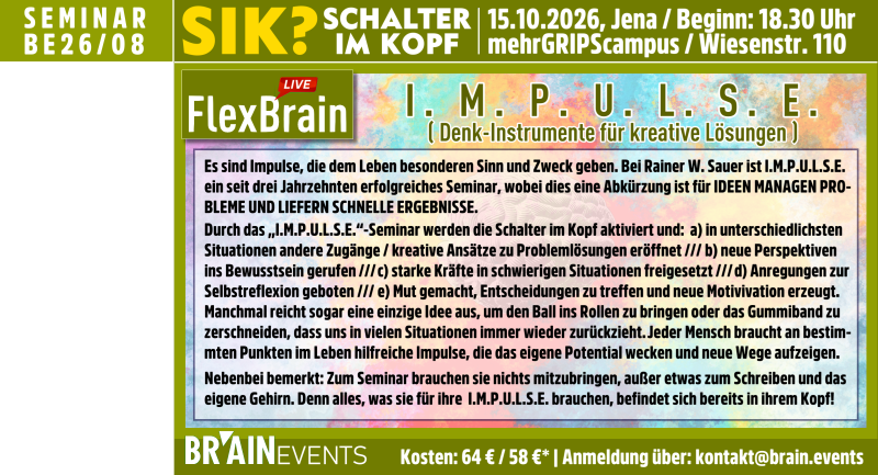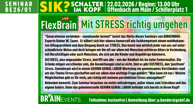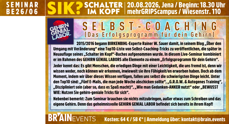 Sie finden hier aktuelle Brain.Events aus den Bereichen: °FLEXBRAIN ||| °WISSEN.LIVE ||| °SIK? (SCHALTER IM KOPF) ||| °IMAGINE ||| DAS °GEHIRN-GENIAL LABOR ||| °ZUKUNFTSCOACHING