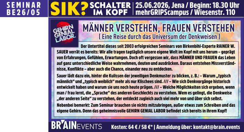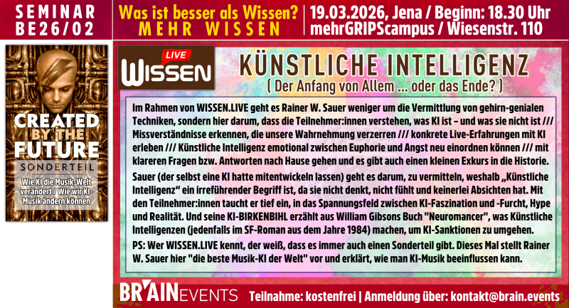 Weitere in Planung und / oder Vorbereitung befindliche Brain.Events findet man AUF DIESER SEITE! . Dort finden sich auch einige Infos zu vergangenen Veranstaltungen! /// Hinweis: Die hier benannten Veranstaltungsorte sind nur insoweit relevant, als dass die vorgesehenen Teilnehmerzahlen erreicht werden. Liegen sie tatsächlich darunter oder darüber, kann durch BRAIN.EVENTS ggf. ein Wechsel der Location am gleichen Standort erfolgen. Veranstaltungsflyer mit Anmeldeformular können Sie auch auf der Webseite www.brain.events herunterladen!