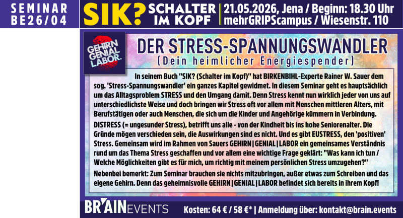 Tag 1: „SYMBOLE bestimmen unser Denken“ plus: „PROBLEME – Weshalb wir sie verschieben, anstatt sie zu lösen“ /// Tag 2: „ABSCHALTEN ist für Körper und Seele unabdingbar“ sowie „Es gibt keinen falschen Entscheidungen, es gibt KONSEQUENZEN“ plus: „UP-DATES: Neues aus der NEUROWISSENSCHAFT und dem BIRKENBIHL ARCHIV“. => MEHR INFOS